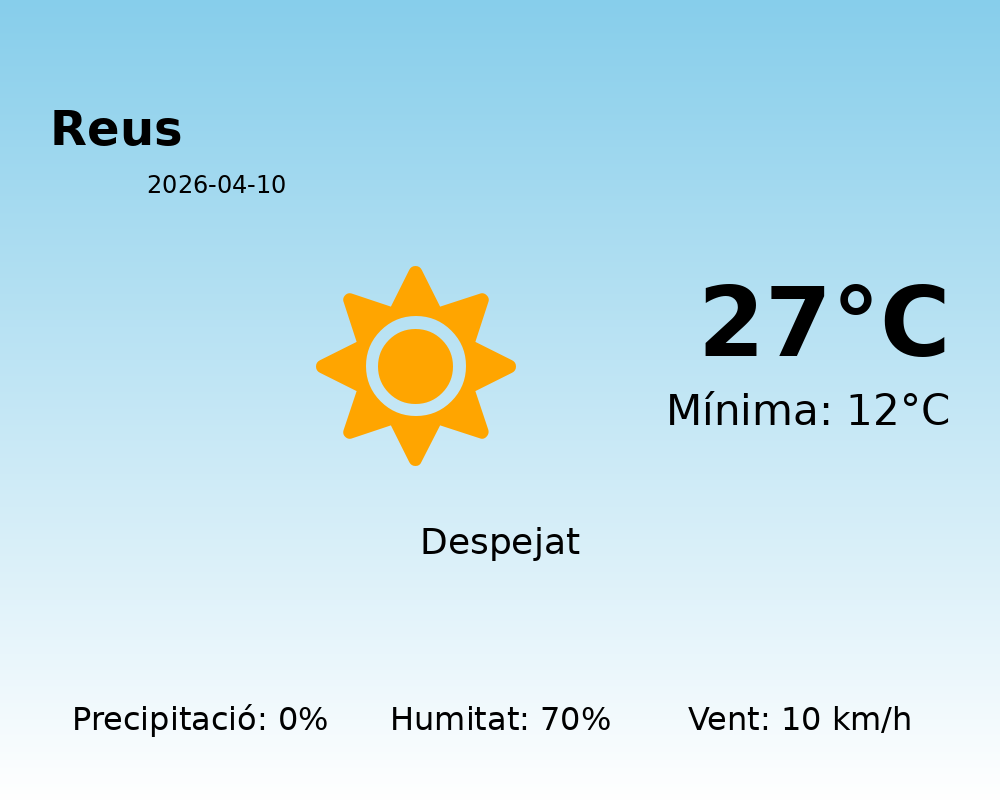 El dia d’avui, 10 d’abril de 2026, a Reus es presenta amb condicions meteorològiques molt agradables, ideals per gaudir a l’aire lliure. Ens espera un dia sense precipitacions, així que els paraigües es poden quedar a casa.