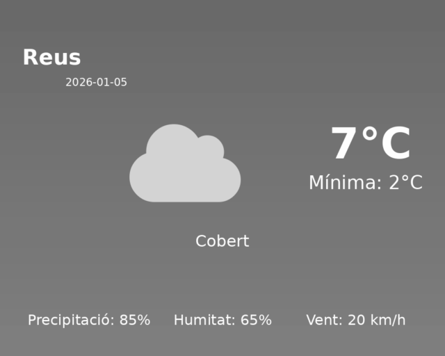 Avui, la ciutat de Reus experimentarà un dia hivernal força fred amb temperatures que es mouran entre els 2°C al matí i els 7°C durant les hores centrals del dia. S’espera que el cel estigui parcialment cobert de núvols, fet que reflexa el codi d’estat del cel 16.