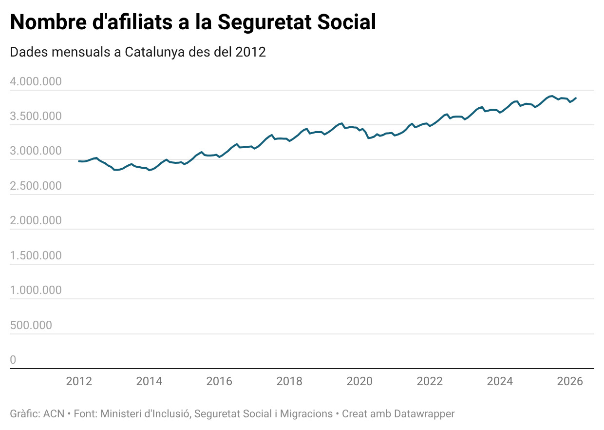 Pel que fa a l’afiliació a la Seguretat Social, creix en 32.415 persones al març a Catalunya, un increment del 0,84%. En total, durant el tercer mes de l’any hi havia 3,88 milions d’afiliats a la Seguretat Social, un increment de 75.961 treballadors en un any (+2%).