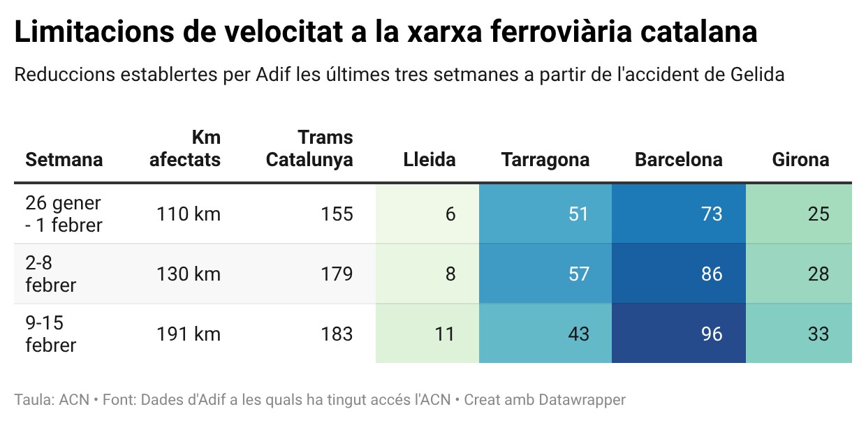 Tot i que en el còmput total hi ha tan sols quatre trams més respecte la setmana anterior (de 179 a 183), Adif ha afegit 29 trams nous amb Limitació Temporal de Velocitat (LTV) a la llista. Les raons que expliquen aquest fet són diverses. Un dels motius és que algunes incidències que hi havia en trams consecutius o quasi consecutius s’han unit en una única limitació, però que abasta més quilòmetres. El cas del tram entre Riba-roja d’Ebre i Reus n’és un exemple, ja que la setmana que ve es referenciarà com una única limitació -de 72 quilòmetres de llargada- mentre que al document d’aquesta setmana hi constaven disset trams diferents.
