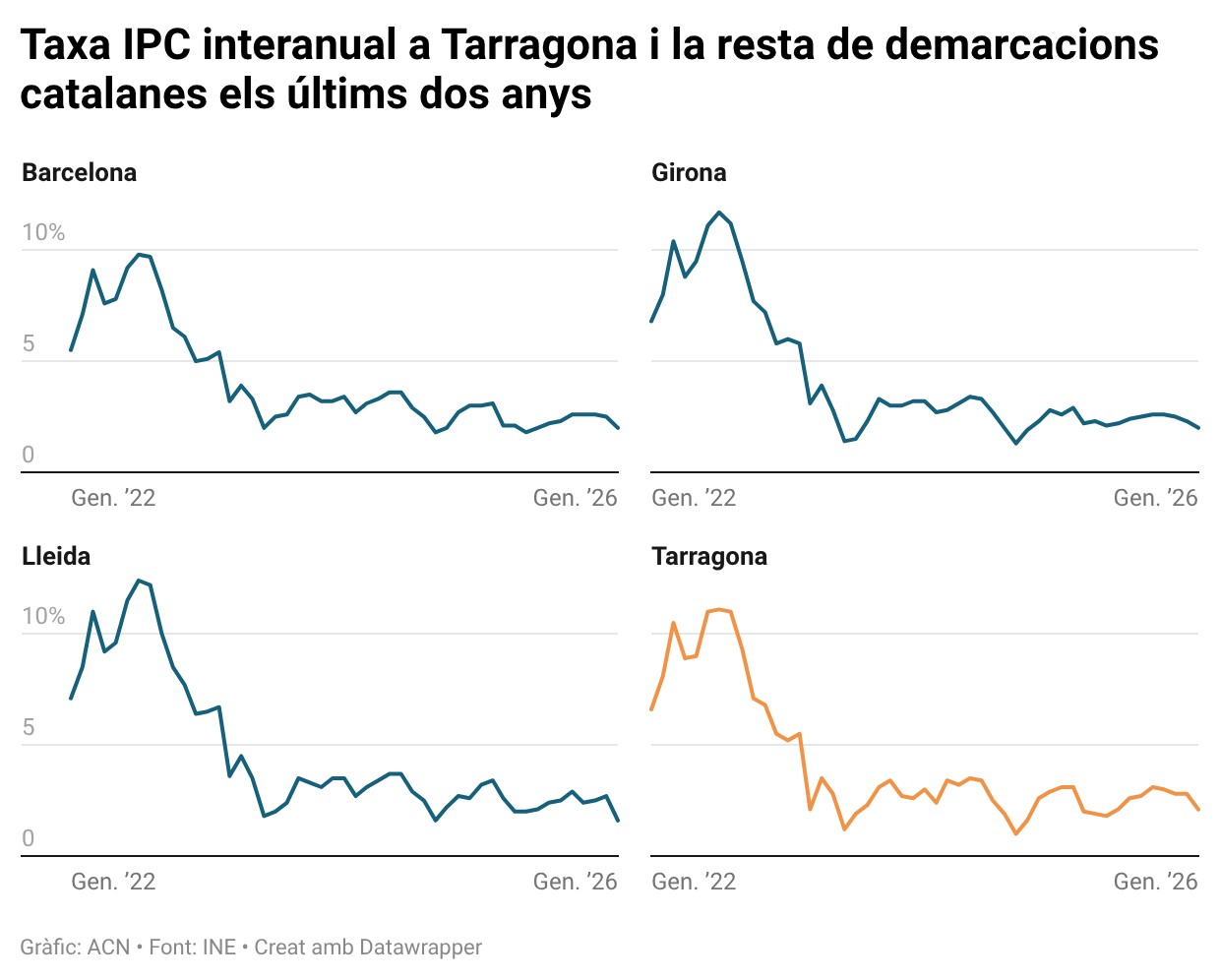 ACN Tarragona – Els preus han moderat el seu creixement al Camp de Tarragona i les Terres de l’Ebre aquest mes de gener. L’IPC interanual publicat per l’Institut Nacional d’Estadística (INE) s’ha situat en el 2,1%, un 0,7% menys que fa un any. Les begudes alcohòliques, amb un 4,9%; els restaurants i allotjaments, amb un 4,1%; i les assegurances, amb un 5,4%, són els capítols que més han pujat respecte fa un any. Per contra, els transports baixen un -1,3%; l’habitatge, l’aigua i l’electricitat, moderen la pujada amb un 1,7% respecte el 5,1% de gener de 2025; mentre que l’alimentació s’incrementa el 2,9%, dues dècimes menys que fa un any.