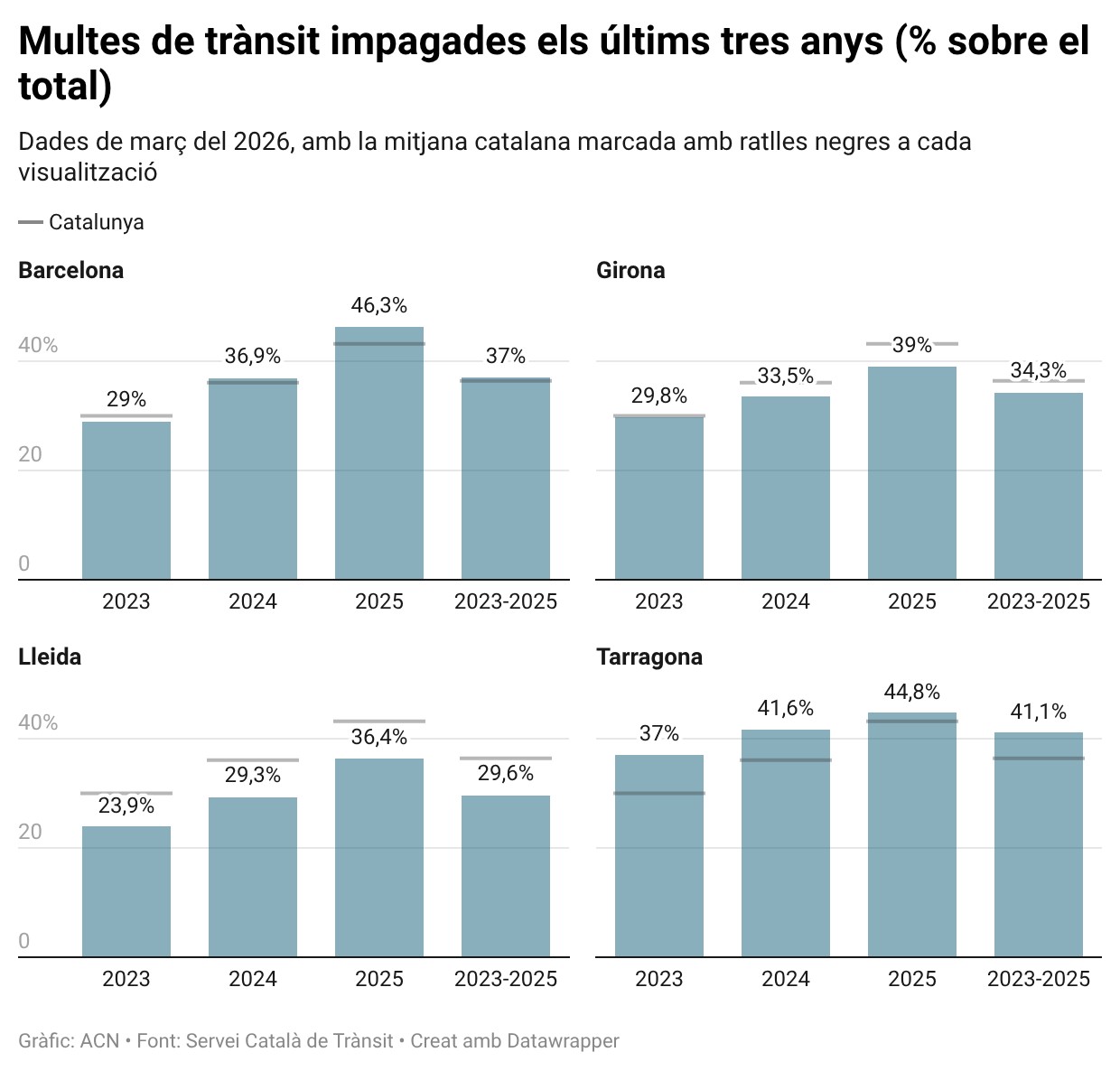 Per demarcacions, els volums d’impagaments són dispars: en els últims tres anys, les comarques del Camp de Tarragona i Terres de l’Ebre lideren el rànquing, amb un 41,1% de les multes imposades que no es paguen voluntàriament, una xifra que supera el mig milió. El 37% dels infractors de les comarques de Barcelona tampoc han liquidat les sancions, cosa que representa 1,3 milions de conductors –tenint en compte només les del 2025, els impagaments s’apropen a la meitat–. El percentatge pel que fa a Girona en els últims tres anys és del 34,3%, per sota de la mitjana catalana, i Lleida tanca el rànquing amb el 29,6%, així que set de cada deu multats de les comarques de Ponent paguen les sancions. En conjunt, les comarques barcelonines acumulen pràcticament tantes sancions com Girona, Lleida i Tarragona sumades.