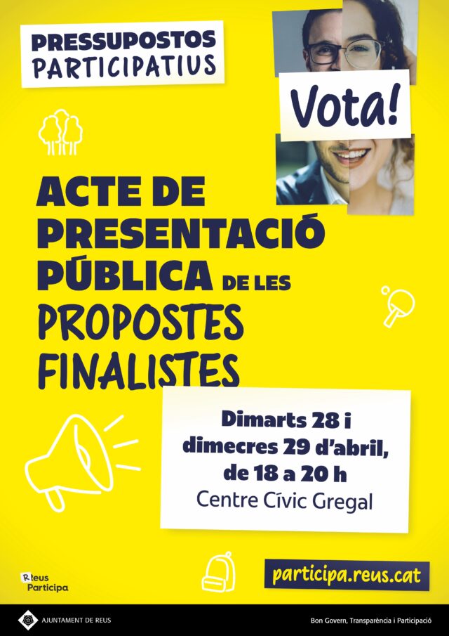 La ciutadania de Reus tindrà l’oportunitat de conèixer de manera directa les propostes que han arribat a la fase de votació dels Pressupostos Participatius. Els dies 28 i 29 d’abril, s’organitzaran sessions al Centre Cívic Gregal on els proposants podran presentar les seves idees i cercar suport ciutadà per a la seva implementació.