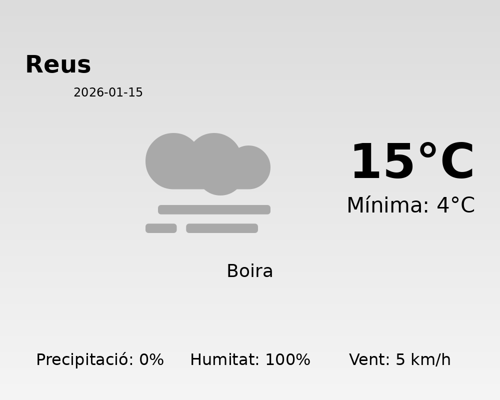 Avui, 15 de gener de 2026, la ciutat de Reus gaudirà d’un dia amb temperatures agradables per a l’època de l’any. Esperem una temperatura màxima de 15 graus Celsius i una mínima de 4 graus Celsius. Aquestes temperatures proporcionaran una jornada relativament suau durant el dia però fresca durant la matinada i el vespre.