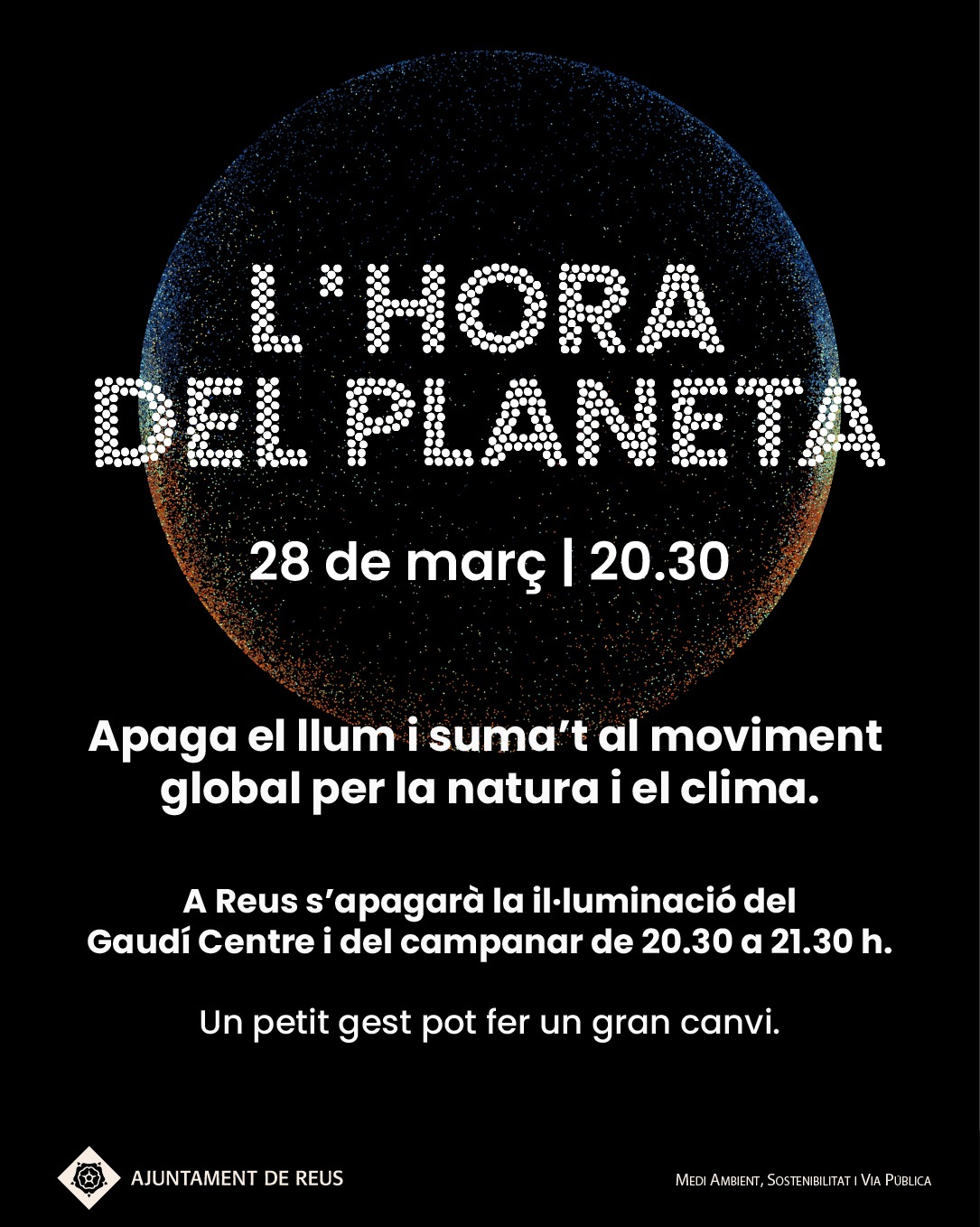 Els pròxims 28 de març, de 20:30 h a 21:30 h, Reus s’unirà a la iniciativa global Hora del Planeta promoguda per WWF. En aquesta edició, que marca el seu 20è aniversari, es convida a apagar llums d’edificis emblemàtics com el Gaudí Centre i el campanar de Sant Pere, en un gestança de compromís amb el planeta.