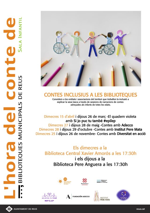 Per quart any consecutiu, l’Ajuntament de Reus presenta una nova edició del cicle ‘Contes Inclusius’ a les biblioteques municipals. Aquesta iniciativa té com a objectiu permetre que les entitats que treballen pels drets de les persones amb discapacitat puguin mostrar la seva tasca a través de sessions de narració de contes, dirigides a infants de totes les edats.