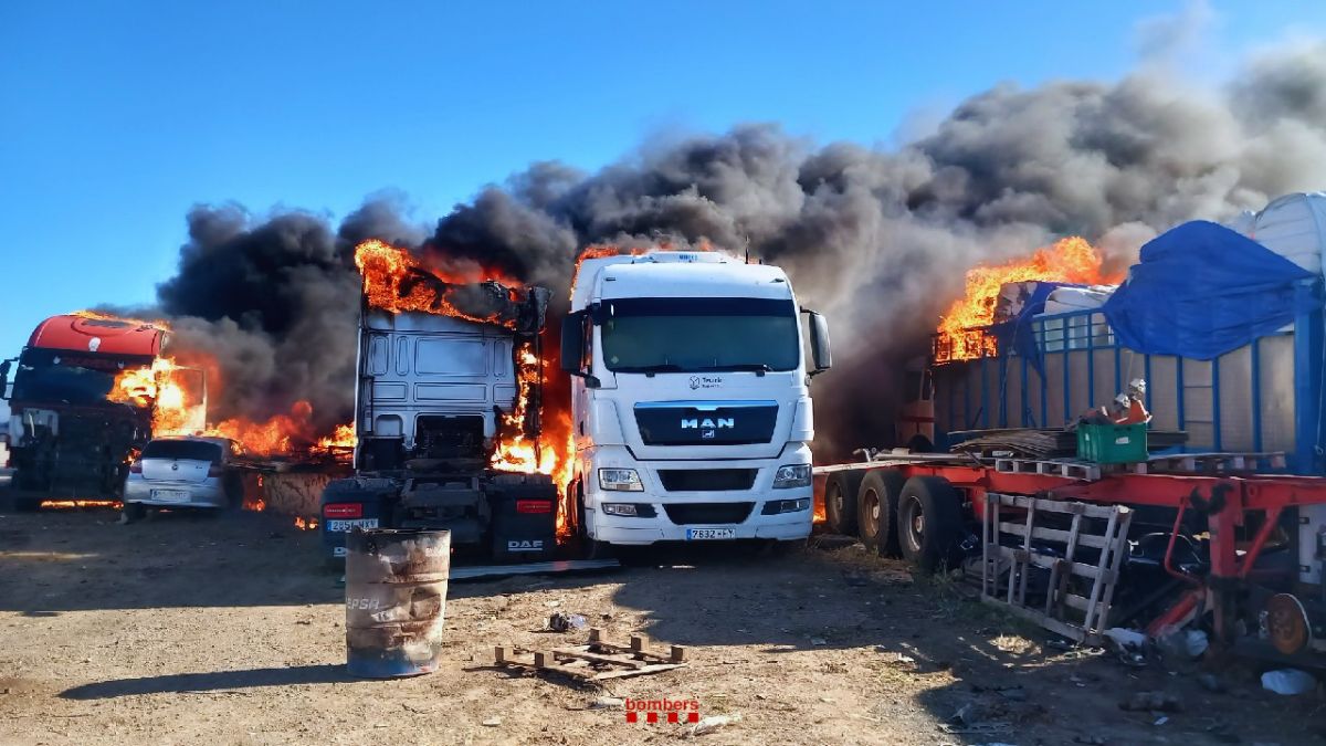 En les imatges difoses es poden veure diversos camions envoltats per les flames, amb foc actiu tant a la cabina com a la zona de càrrega d’alguns vehicles. L’incendi també ha provocat l’expansió del fum a gran altura, fet que ha obligat a reforçar el dispositiu per evitar la propagació a altres vehicles o instal·lacions properes.
