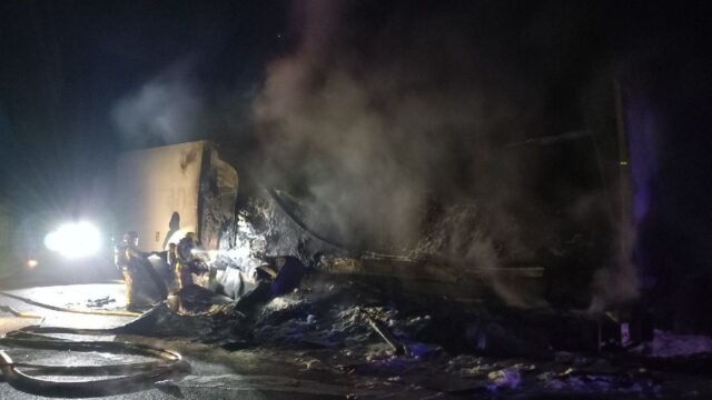 Controlat l'incendi d'un camió al quilòmetre 274 de l'Ap-7 a Mont-roig del Camp (avís 04.33h @112). Ha cremat parcialment el remolc que transportava palets de plàstic i hem evitat que el foc propagués a la tractora. No consten ferits.