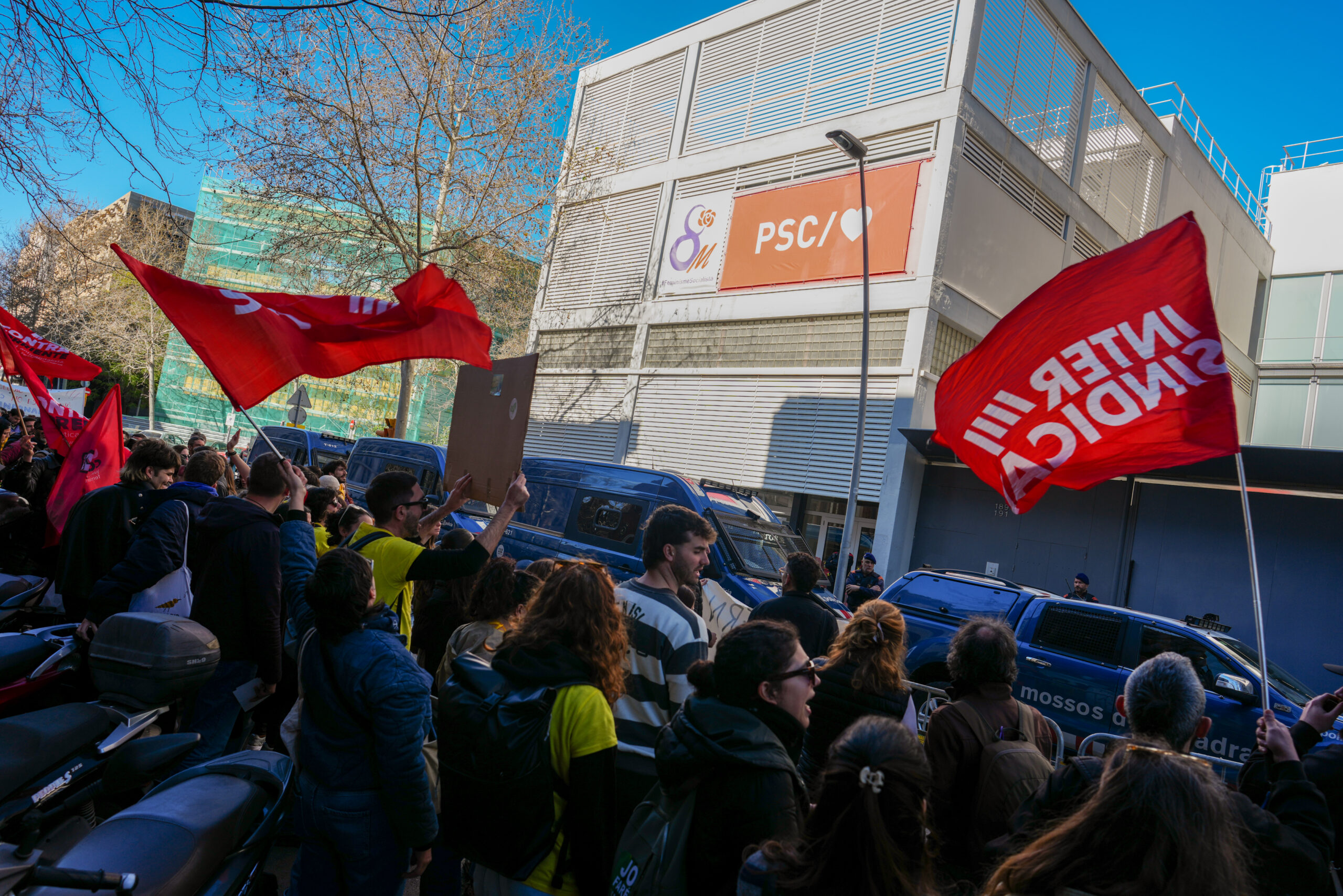 ACN Barcelona – Unes 300 persones s’han concentrat davant la seu del PSC a Barcelona, al carrer Pallars, per protestar contra l’acord entre el Govern i els sindicats CCOO i UGT i continuar exigint millores laborals i salarials. Els manifestants havien quedat a la parada de metro de Llacuna i s’han desplaçat fins a la seu dels socialistes, que estava acordonada pels Mossos. Els manifestants han llençat petards i han cantat consignes com ‘Illa, ens dones calderilla’, ‘Vergonya’, ‘On estan, no els veiem, CCOO i UGT’ i ‘Volem l’augment de sou dels Mossos d’Esquadra”. Els manifestants s’hi han estat uns 45 minuts i posteriorment han començat a caminar amb la voluntat d’arribar a plaça Urquinaona, i sumar-se a la manifestació convocada per a les 12.30 hores.